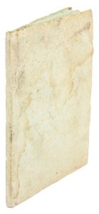 Stampato su carta azzurrina. Minime tracce di muffa lungo la cucitura dei fascicoli, ampia gora d'acqua alla prima e ultima carta, bianche, ma bella copia. Cartonato muto coevo con sguardie in carta azzurrina, ampie ma lievi gore d'acqua ai piatti.