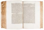Legatura coeva in piena pergamena con titoli un tempo manoscritti al dorso ormai sbiaditi. Cerniere del piatto anteriore riparate, un taglio al piatto anteriore e punte stanche.