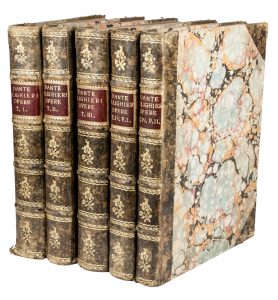 Pagine [16], XLVIII, CCCCVIII con 41 tavole incise in rame ; CCCCXIII, [3] e 32 (di 33) carte di tavole ; CCCCLII, [4], 103, [1] con 33 tavole calcografiche fuori testo ; XII, 408 ; con 4 incisioni fuori testo ; [4], 264, LXXXIV, [4] con 1 tavola (di 4) fuori testo. Esemplare con nel complesso 111 tavole (di 115), incluse l'antiporta allegorica, il ritratto della Dedicataria Elisabetta Petrowna, la Dedica incisa, il Ritratto in ovale di Dante e la tavola con le medaglie al primo volume.