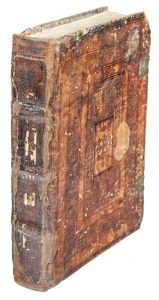 Legatura coeva in piena pelle montata su assi di legno con cornici concentriche di fasci di filetto e motivi fitomorfi stilizzati impressi a secco ai piatti, con fregio floreale al centro.