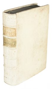 legatura settecentesca in piena pergamena con grande fregio arabeggiante impresso a secco al centro dei piatti inquadrato da cornici di filetti e a catenella impressi sempre a freddo ; titoli dorati su falso tassello al dorso.