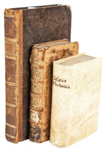 Esemplare rifilato, con fioriture, qualche forellino di tarlo e piccole gore d'acqua marginali, evidente restauro all'ultima carta di testo. Legatura coeva in piena pergamena rigida con titolo manoscritto al dorso.
