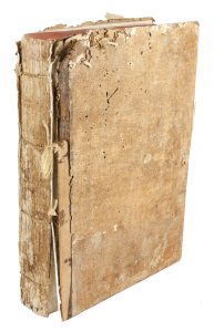 In-folio (mm 308x210). Pagine [8], 583 [i.e. 613], [1]. Esemplare scompleto di due carte e con il primo fascicolo più corto di margini ricomposto forse anticamente ; macchie d'inchiostro, tarli marginali e altri difetti. Capilettera incisi in legno e una vignetta xilografica ripetuta più volte nel testo. Legatura posteriore in mezza pelle su assi di legno rivestite con carta marmorizzata, dorso assente e piatti lisi.