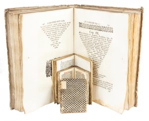 Venetiis : per Stephanum de Sabio, 1525. In-16° (mm 104x69). Carte 144. Frontespizio e testo stampati in inchiostro rosso e nero, vignette xilografiche al frontespizio e al colophon. Fioriture e forellini di tarlo sparsi, prove di scrittura in principio e in fine di volume. Cartonato muto settecentesco.