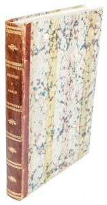 Legatura ottocentesca in mezza pelle con piatti in carta marmorizzata, un poco lisa.