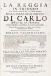 La Placa Pietro, La Reggia in trionfo per l'acclamazione, e coronazione della Sacra Real Maestà di Carlo Infante di Spagna... In Palermo : Nella Regia Stamperia d'Agostino, ed Antonino Epiro, 1736.