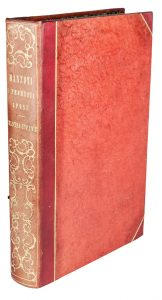 Legatura coeva in mezza pelle rossa con punte e piatti in percallina decorata a freddo e bordata da filetti impressi in oro, decorazioni e titoli dorati al dorso. Piatto anteriore della brossura originale conservato all'interno.