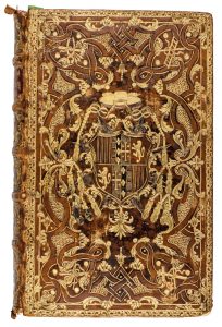 Bella legatura romana coeva alle armi con le insegne vescovili di un Acquaviva d'Aragona, probabilmente Troiano, al centro dei piatti, inquadrate da una sontuosa ed elaborata cornice a nastri intrecciati, fregi floreali e piccoli ferri con gli strumenti della Passione, ripetuti al dorso, il tutto finemente impresso in oro ; titoli ugualmente dorati al dorso a 5 nervi, dentelle floreale alle unghiature, tagli dorati, cesellati e con graziosi fregi floreali a colori.