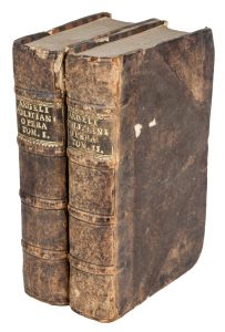 Marca dello stampatore ai frontespizi e in fine, capilettera figurati, il tutto xilografico. Legatura settecentesca in mezza pelle con punte, titoli impressi in oro su falso tassello al dorso.