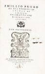 ►Rarissima traduzione italiana a cura di Remigio Nannini di questa raccolta di biografie di uomini illustri di Cornelio Nepote, erroneamente attribuita a Aemilius Probus che in realtà fu autore solo del sunto.