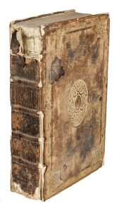 Legatura coeva in piena pelle con placca centrale dorata e cornice con motivi stilizzati accantonati interni.