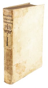 Legatura settecentesca in piena pergamena con titoli manoscritti al dorso. Una gora alla cuffia inferiore, macchie sui piatti.