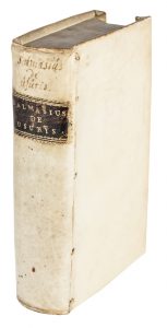 Legatura coeva in piena pergamena con risvolti, titoli sia calligrafati che impressi in oro su tassello al dorso.