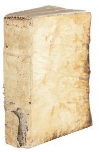 Legatura coeva in pergamena floscia, lacerti di legacci, macchie ai margini dei piatti e lacune al dorso.