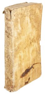 Legatura coeva in pergamena semifloscia con risvolti, titoli manoscritti ormai sbiaditi al dorso.
