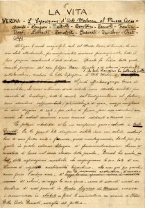 Fiumi Lionello, La Vita. Verona - L'Esposizione d'Arte Moderna al Museo civico : Donati, Longoni, Mattiolli, Beraldini, Zancolli [...] Casorati, Zamboni, Prati, Capri. Non datato ma 1920 circa.