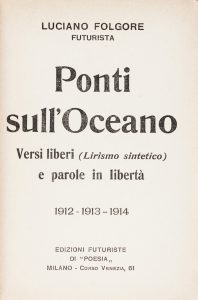 Folgore Luciano, Ponti sull'oceano. Versi liberi e parole in libertà. Milano : Edizioni Futuriste di 'Poesia', 1914.