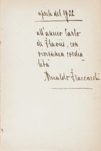 Esemplare in barbe lievemente brunito, con minime mancanze lungo i margini esterni di alcune carte. Brossura editoriale con piccola mancanza al margine inferiore. Dedica e firma dell'Autore alla prima carta bianca.
