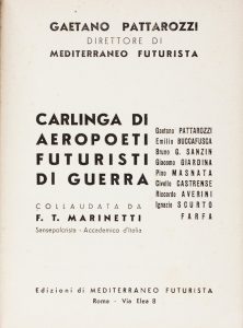 Pattarozzi Gaetano, Carlinga di aeroporti futuristi di guerra. Collaudata da F.T. Marinetti. Roma : Edizioni di Mediterraneo Futurista, [1941].