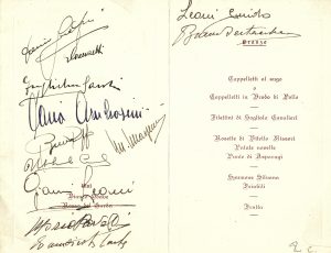 2 menù con firme di campioni in ambito automobilistico e motociclistico. Datati : Anni '50.