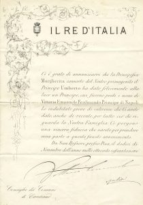 Documento a stampa nel quale si annuncia la nascita di Vittorio Emanuele Ferdinando Principe di Napoli. Con firma autografa di Vittorio Emanuele II. Datato 12 novembre 1869.