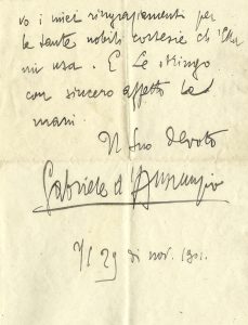 D'Annunzio Gabriele, Lettera autografa firmata. Datata 29 novembre 1901.