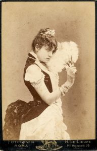 Duse Eleonora, 2 ritratti fotografici all'albumina applicata su cartone. 'Fotografia Roma H. Le Lieure'. Fine XIX secolo.