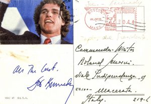 Kennedy Rose, Firma autografa su cartolina. Datata 1985 (da timbro postale) con busta originale conservata.