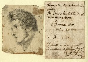 "Thomae de vio Cardinalis Ca /jetani / In libros Aristitelis de A / nima Commentaria / Bononiae 1617 [ [....] ]". Di seguito è indicato il numero del volume e la collocazione. Al margine inferiore della carta è stato scritto da mano antica : "Dichiaro essere questo il carattere di Giacomo Leopardi [ [....] ]". Il volume "Cajetani Thomas. Card. de Vio. Commentarii in predicamenta Aristotelis. [ [....] ] In libro Aristotelis de anima commentaria. Bononiae, 1617" era presente nel "Catalogo della Biblioteca Leopardi di Recanati"