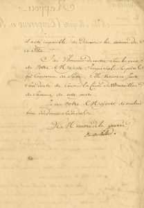 •Risposta su un rapporto firmato dal generale Henri Clarke (1765-1818), duca di Feltre e Ministro della Guerra, a proposito di un rimborso in favore dei soldati del 3° Batt. Zappatori, dislocato a Corfù, rimasti senza paga.