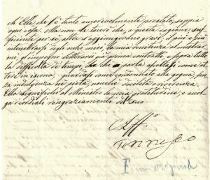 "Stasera o domattina verrò tra le sei e le sette a vedere taluno de' giovani per sentire dal vicino a poco a poco la voce di tutti [ [....] ] La pregherei di lasciarmi uno stanzino ov'io possa [ [....] ] farmi leggere o dettare qualcosa [ [....] ]". Dagli anni '50 Tommaseo ebbe gravi problemi alla vista. Molte sue lettere di quel periodo hanno pertanto solo la firma autografa.(4)