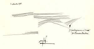 Bussotti Sylvano, 1 disegno musicale siglato dal titolo '5 pentagrammi e 1 nota' e 1 biglietto autografo siglato. Datato 1 settembre 1975.