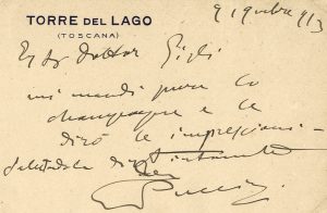 Puccini Giacomo, Biglietto autografo firmato inviato al Sig.r Gigli. Datato 9 novembre 1913.