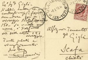 Puccini Giacomo, Cartolina postale viaggiata, autografa firmata inviata al Sig.r Gigli. Datata 8 febbraio 1918 (da timbro postale).
