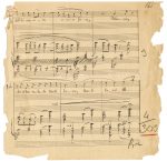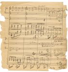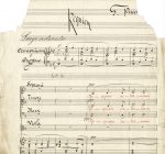 Manoscritto musicale (12 pentagrammi) a inchiostro nero, rosso e matita grigia. Spartito per canto e pianoforte.