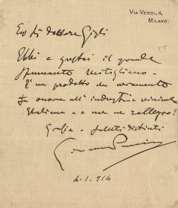 Puccini Giacomo, Lettera autografa firmata inviata al Sig.r Gigli. Datata 4 gennaio 1914.