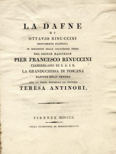 Rinuccini Ottavio, La Dafne […] Nuovamente stampata in occasione delle felicissime nozze del Signor marchese Pier Francesco Rinuccini […] con la nobil donzella la Signora Teresa Antinori. Firenze, Borgognissanti 1810.