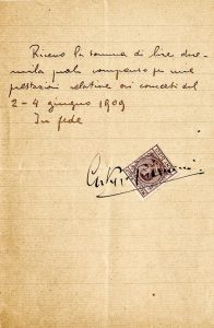 Toscanini Arturo, Ricevuta di pagamento con firma autografa. Datata 1909.