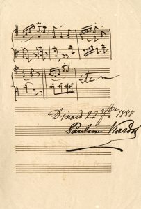 Viardot-Garcìa Pauline, Lunga citazione musicale autografa (17 battute) di una 'Gavotte'. Con firma. Datata 1888.