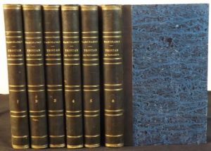 6 volumes in-8° reliés demi-basane bleu nuit, dos lisses ornés dix double rang de filets or en place de nerfs.