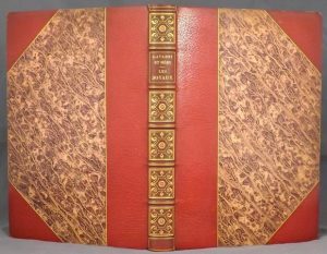 Reliure demi-maroquin rouge à coins, dos à nerfs orné de filets or et de rinceaux formant caissons, tête dorée, couverture conservée.