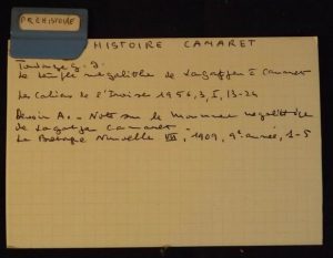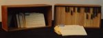 Deux casiers en bois contenant plus de 800 fiches bristol (10 x 15 cm.) sur lesquelles sont notées des descriptions d’ouvrages, notes manuscrites et/ou découpages de fiches de catalogues imprimés.
