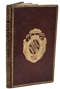 reliure de l’époque maroquin rouge, filets dorés en encadrement, armes au centre, dos lisse orné de croisillons dorés, gardes de papier dominoté avec étoiles dorées, tranches dorées.