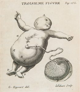 Traité illustré de 9 figures, hors texte, gravées par Lefebvre d’après Revel, dont un portrait de l’auteur très expressif et 8 planches assez curieuses représentant des fœtus mal formés.