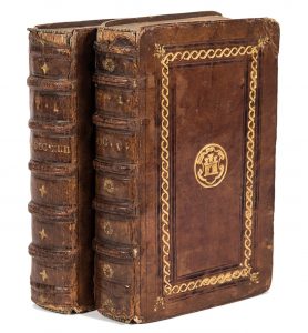 2 ouvrages en 2vol. in-8 de 230 pp., [5] ff., 448 pp., ; 96-648 pp., 22 ff., veau havane de l’époque, filets à froid et torsades dorées en encadrement sur les plats, fleuron aux angles, blason au centre avec un fort à trois tourelles, dos à nerfs ornés de fleurons dorés, tranches dorées et antiquées.