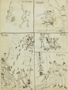 2 pages sur un feuillet in-8 (200 x 152 mm). 5 dessins à l’encre sur le recto ; 2 sur le verso, l’un à l’encre, l’autre à la mine de plomb. Légendes autographes, ainsi que, probablement, le titre