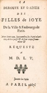 [ANONYME] La Deroute et l'adieu des filles de ioye de la Ville & Faubourgs de Paris. Avec leur nom, leur nombre, les particularitez de leur prise & de leur emprisonnement & requeste a M. D. L. V. À Paris, 1667.