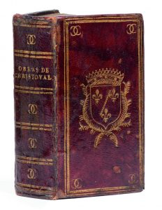 In-18 (65 x 120 mm), maroquin rouge, triple filet doré encadrant les plats, monogramme «CC» entrelacé aux angles, armoiries au centre, dos lisse orné du même monogramme, tranches dorées (reliure de l'époque).