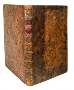 Relié in plano plein veau racé, dos à 7 nerfs et fleurons, trois tranches rouges, frottements sur les plats et le dos et coiffe abîmée.