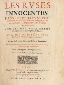 FORTIN (père François).- Les Ruses innocentes, dans lesquelles se voit comment on prend les Oyseaux passagers, & les non passagers : & de plusieurs sortes de Bestes à quatre pieds. Paris, Pierre Lamy, 1660.